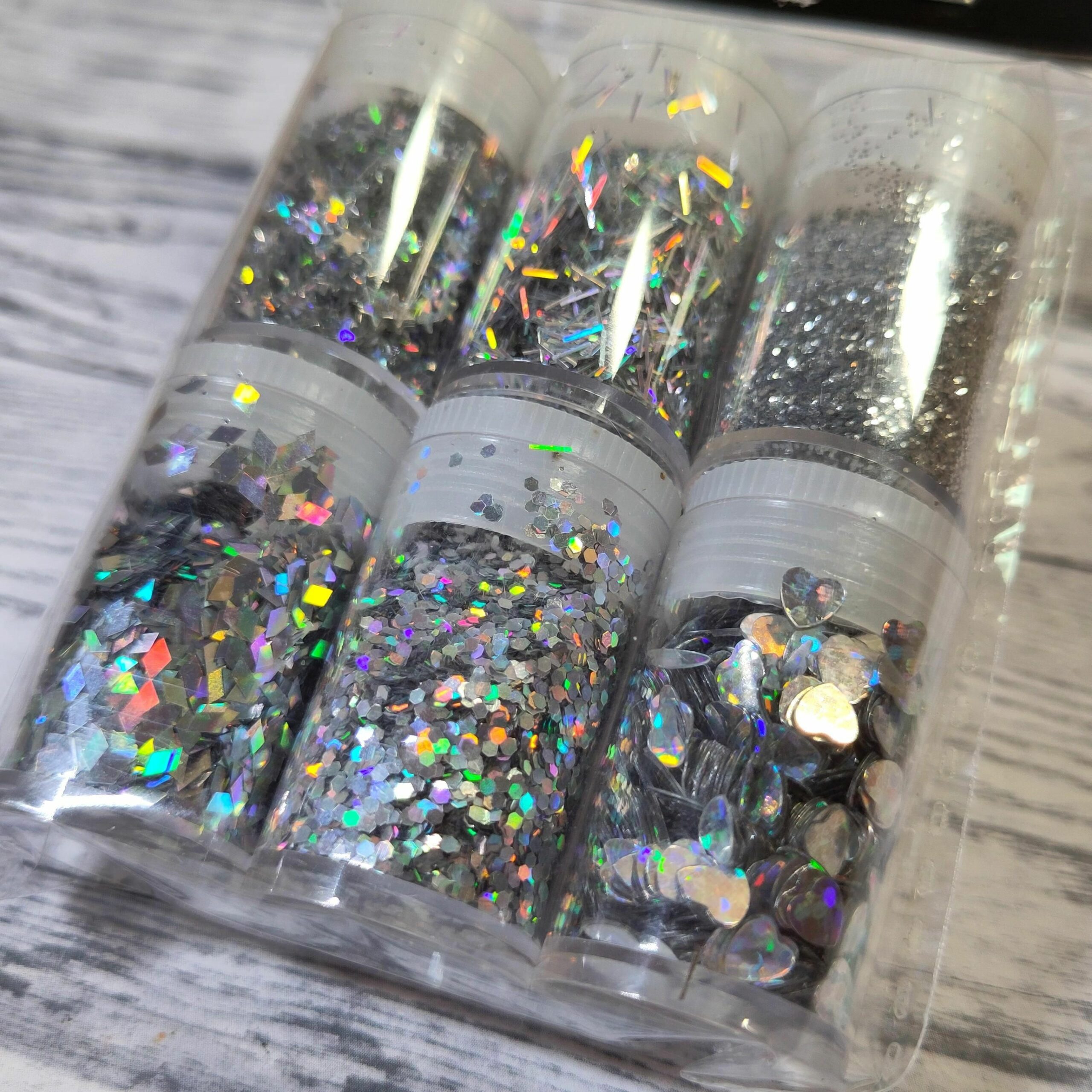 6 st glitterburkar med 5 gram i varje.