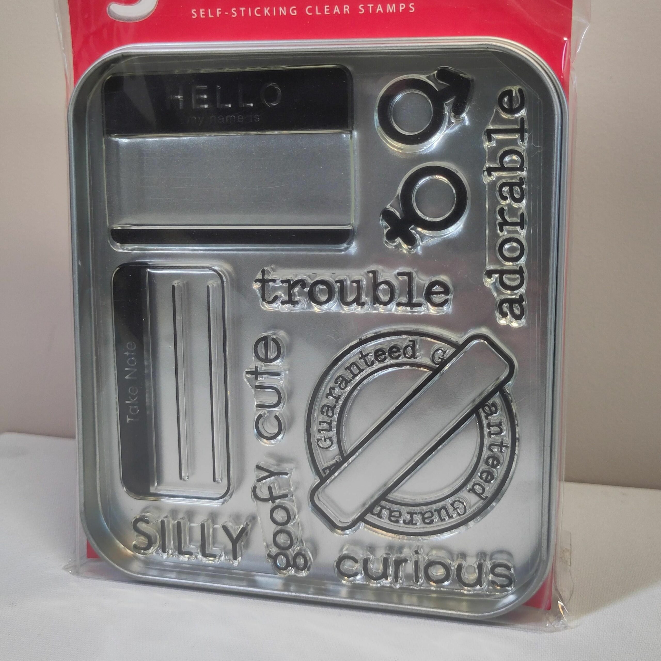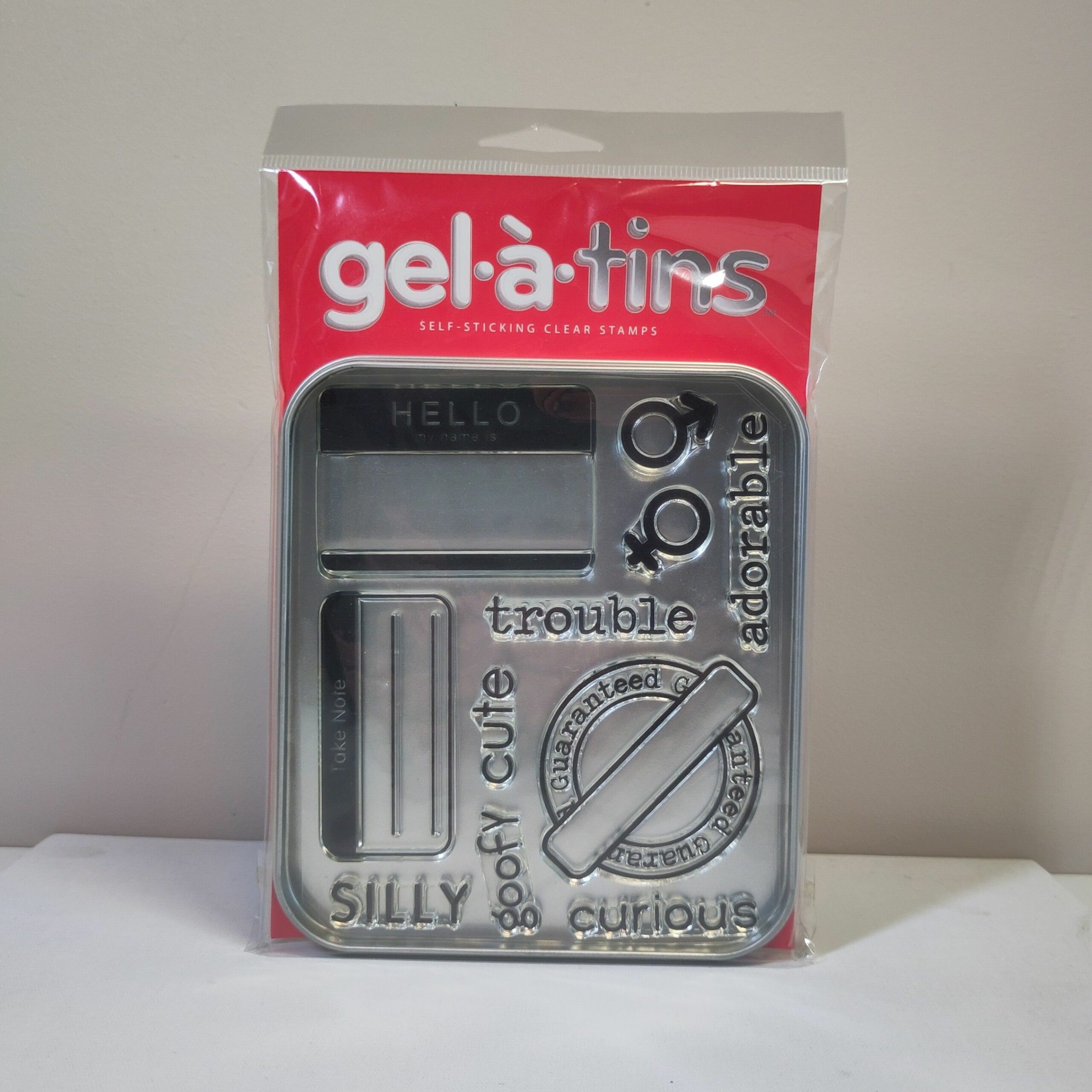 Gel à Tins självhäftande clear stamps med tillhörande plåtask för enkel förvaring!