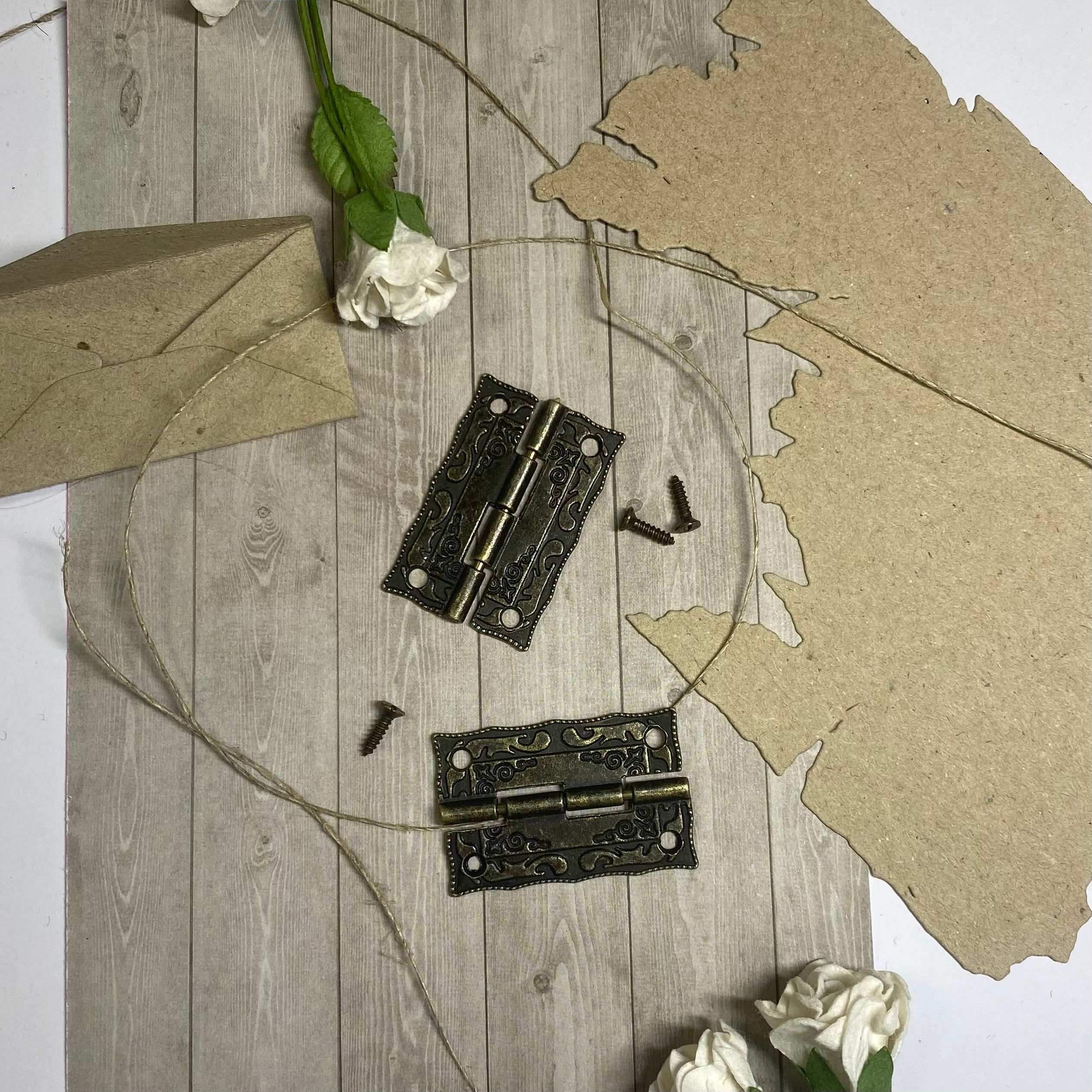 Cute decorative hinges in antique gold color. Includes small screws.