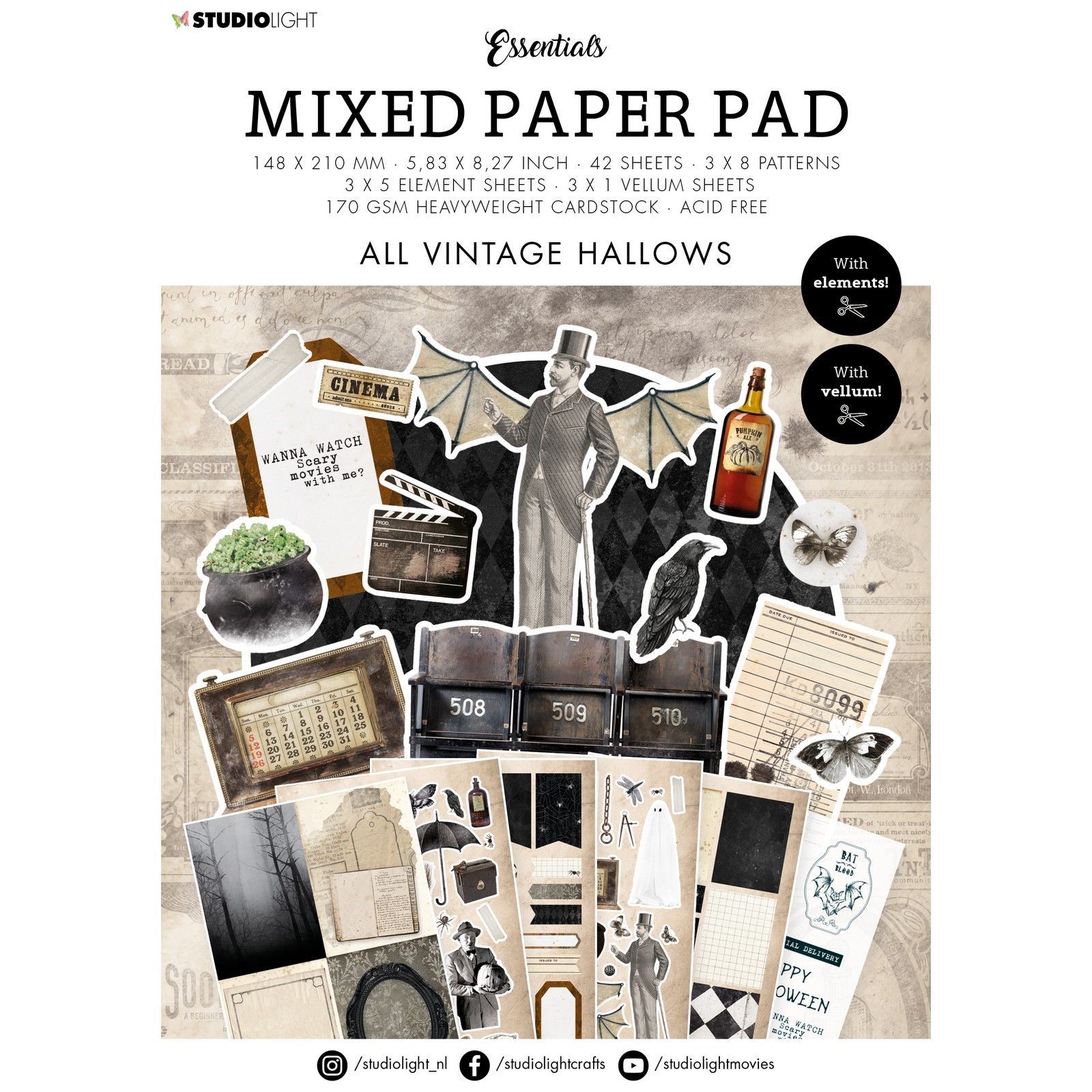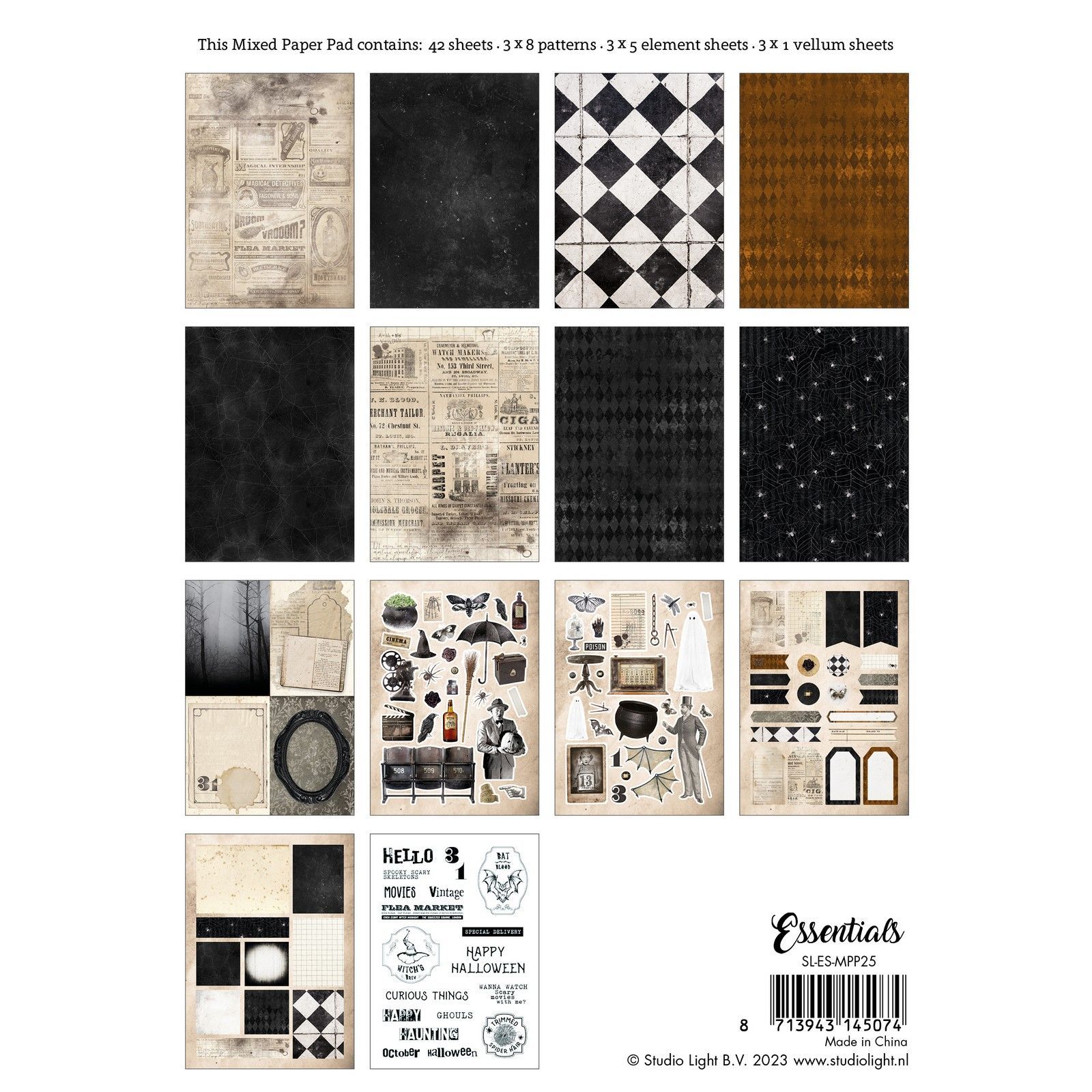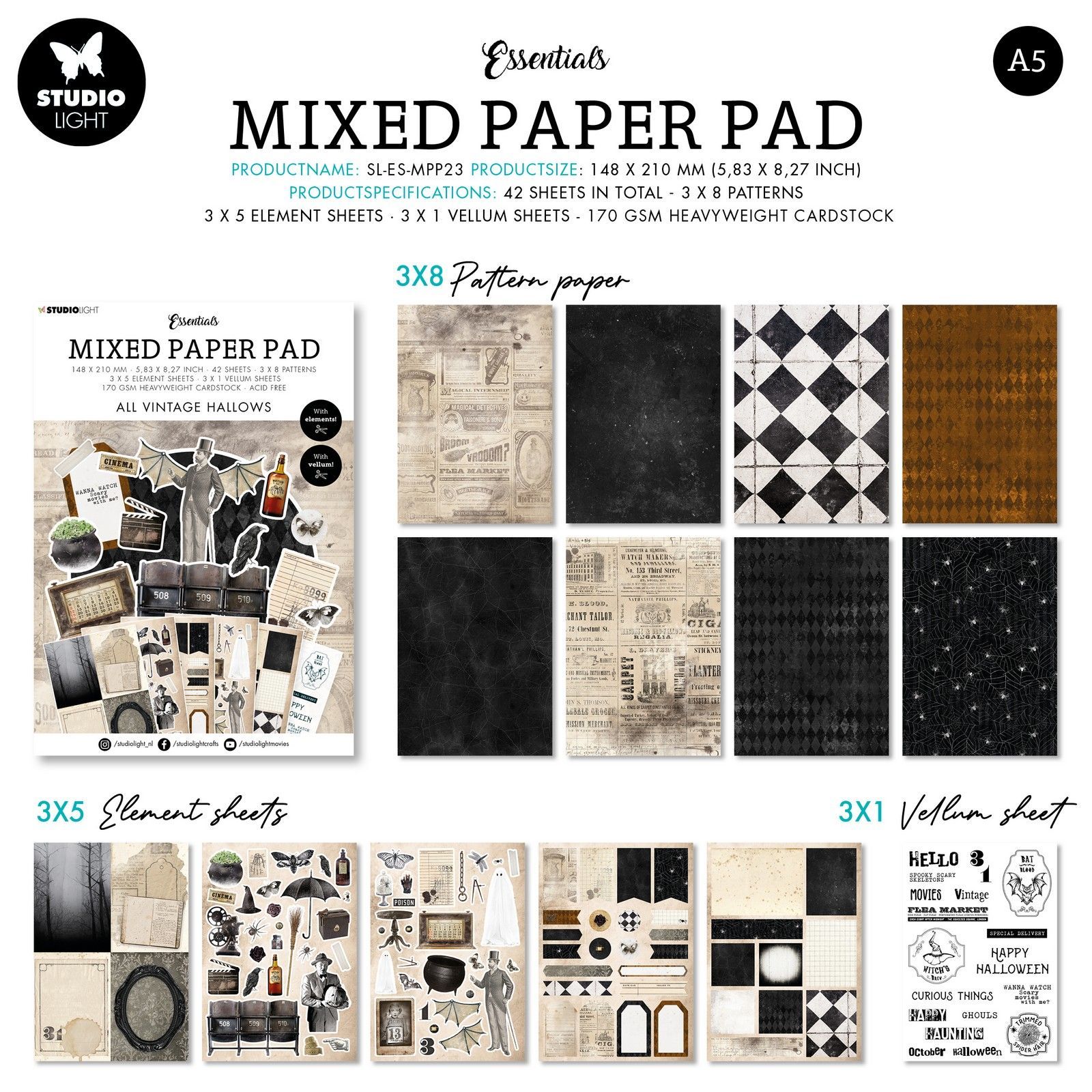 42 pappersark. 3×8 mönster, 3×5 utklippsark, samt 3×1 vellumark.
